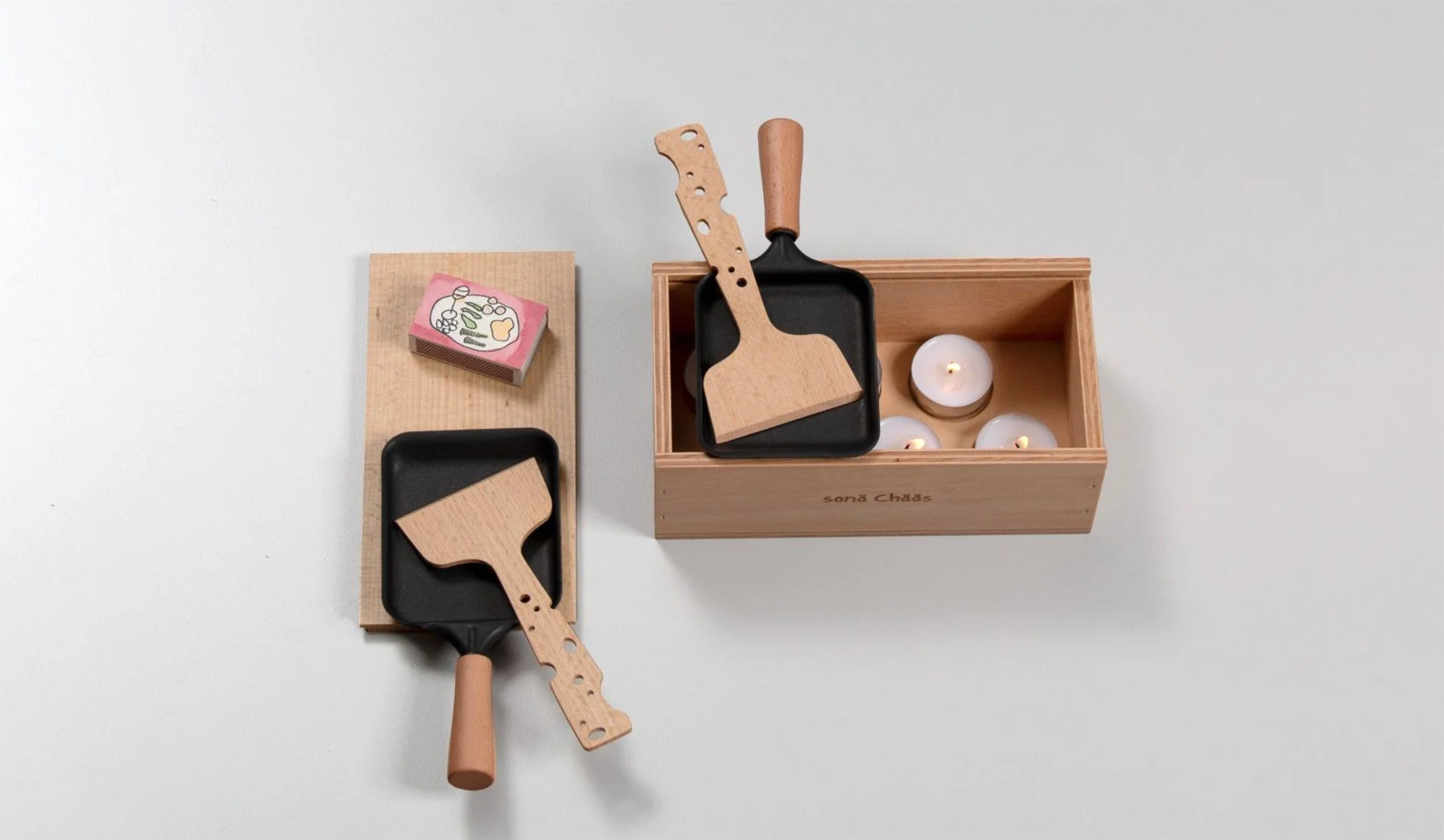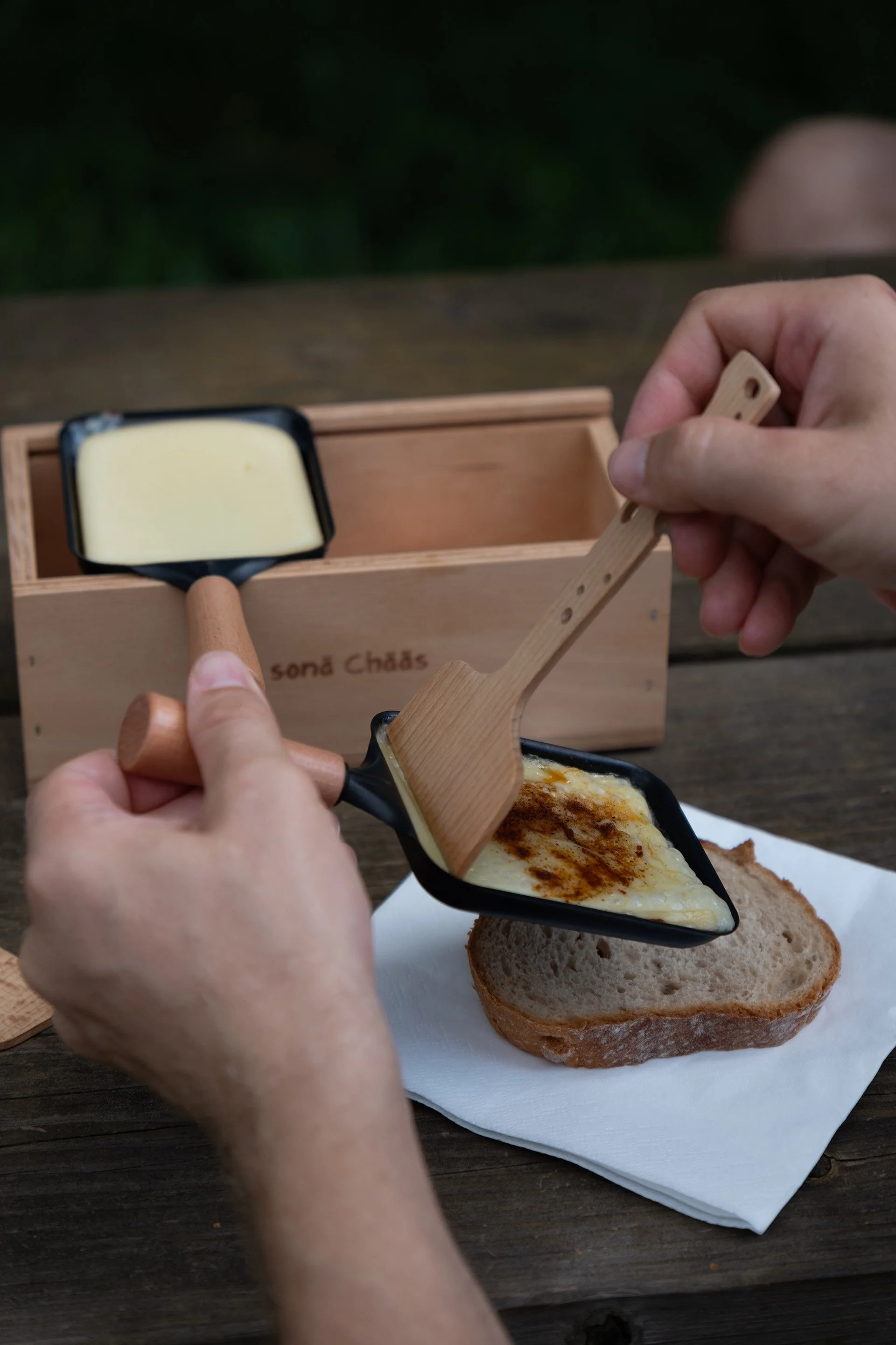 Die chääsförmigen Schaber verleihen dem Raclette Set einen besonderen Charme. Und der Deckel lässt sich als Schneidebrett und Untersetzer verwenden. Doch was dieses Set für uns so besonders macht: Von der Idee bis hin zum letzten Schliff wurde dieses Raclette Set in Zusammenarbeit mit Menschen mit Behinderung entworfen, gestaltet und hergestellt.